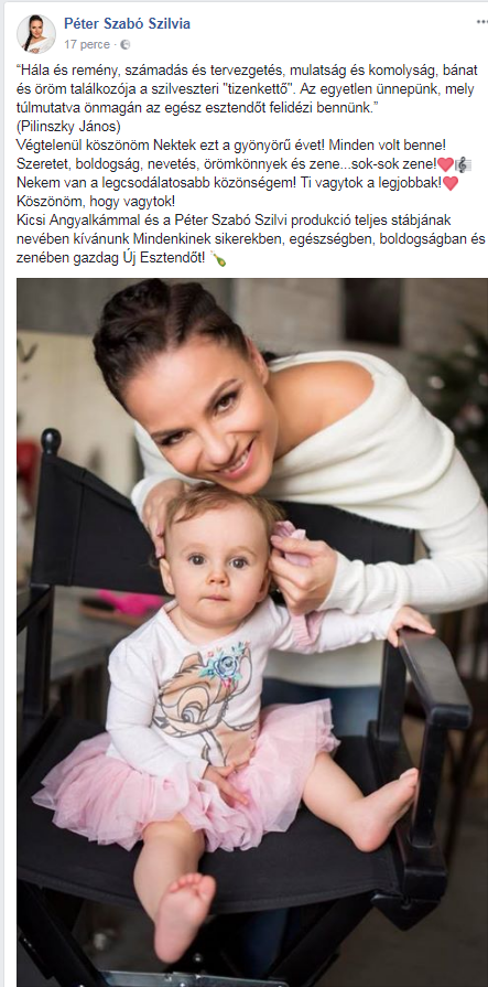 „Végtelenül köszönöm Nektek ezt a gyönyörű évet! Minden volt benne! Szeretet, boldogság, nevetés, örömkönnyek és zene…sok-sok zene!❤️? Nekem van a legcsodálatosabb közönségem! Ti vagytok a legjobbak!❤️ Köszönöm, hogy vagytok! Kicsi Angyalkámmal és a Péter Szabó Szilvi produkció teljes stábjának nevében kívánunk Mindenkinek sikerekben, egészségben, boldogságban és zenében gazdag Új Esztendőt! ?” – közölte az énekesnő.