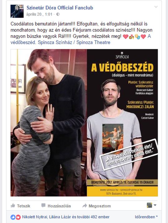„Csodálatos bemutatón jártam! Elfogultan, és elfogultság nélkül is mondhatom, hogy az én édes Férjuram csodálatos színész! Nagyon nagyon büszke vagyok Rá!” – írta Szinetár Dóra a bemutatót követően a hivatalos oldalára.
