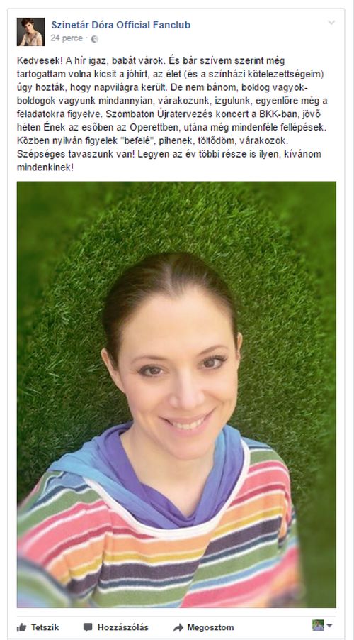 „Kedvesek! A hír igaz, babát várok. És bár szívem szerint még tartogattam volna kicsit a jóhirt, az élet (és a színházi kötelezettségeim) úgy hozták, hogy napvilágra került. De nem bánom, boldog vagyok- boldogok vagyunk mindannyian, várakozunk, izgulunk, egyenlőre még a feladatokra figyelve.” – kezdte Szinetár Dóra.